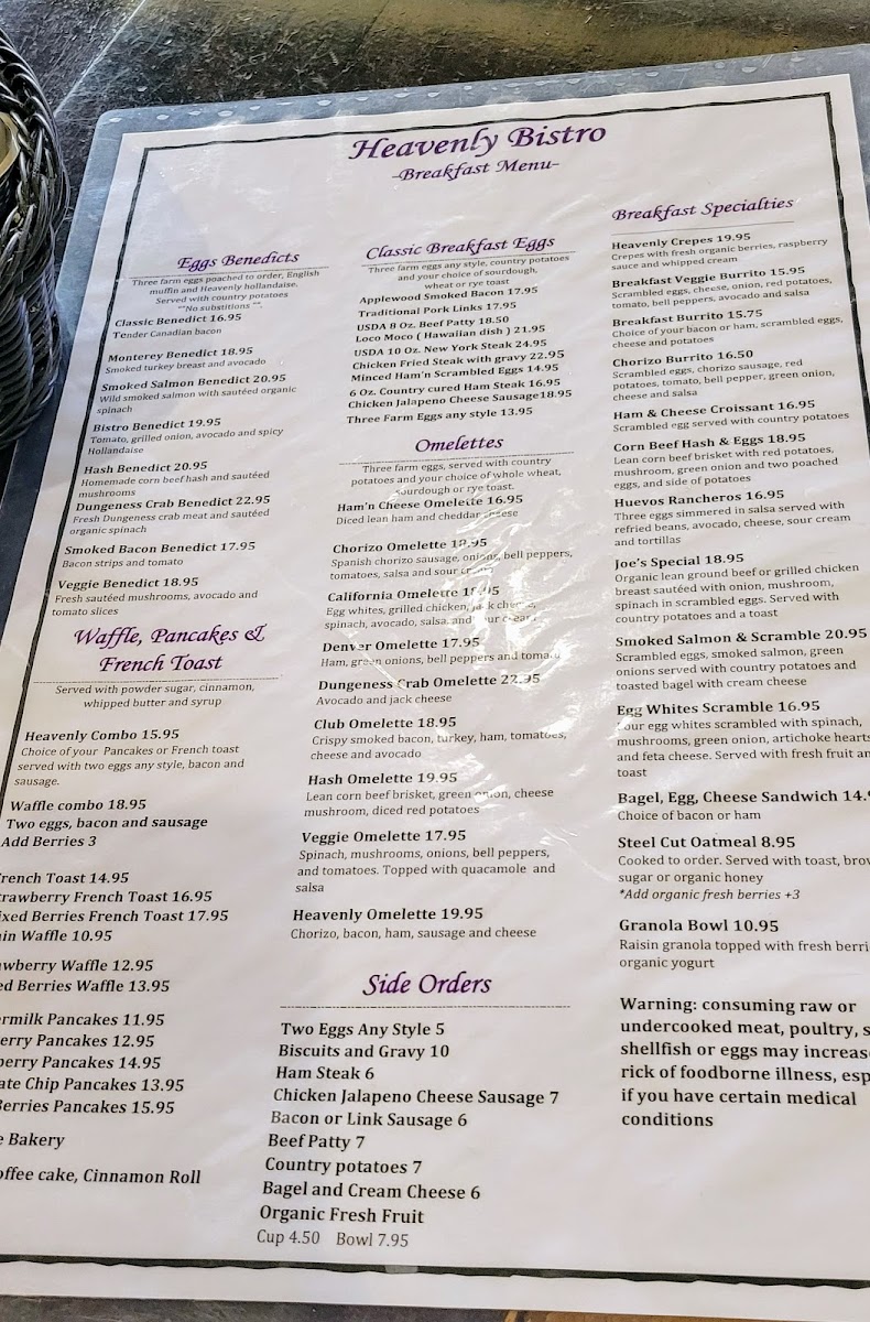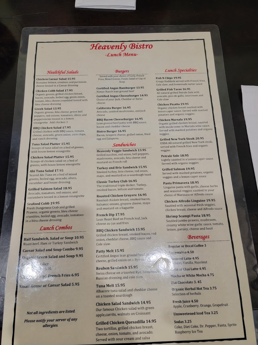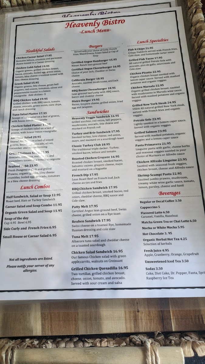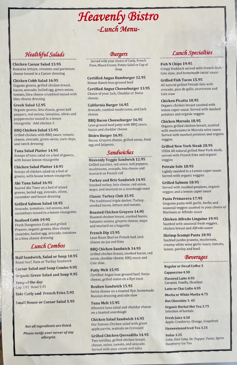Heavenly Bistro isn’t just about breakfast; their Lunch Specialties shine just as brightly. The Fish N Chips, featuring crispy haddock paired with French fries and homemade tartar sauce, is a crowd-pleaser at $22.95, while the Grilled Fish Tacos are a fresh take on lunch, bursting with flavors of wild grilled petrale sole, avocado, and zesty pico de gallo for just $17.95. For those seeking heartier fare, the Chicken Picatta ($23.95) offers a delectable balance of organic chicken breast sautéed with lemon caper sauce served with mashed potatoes and organic veggies.