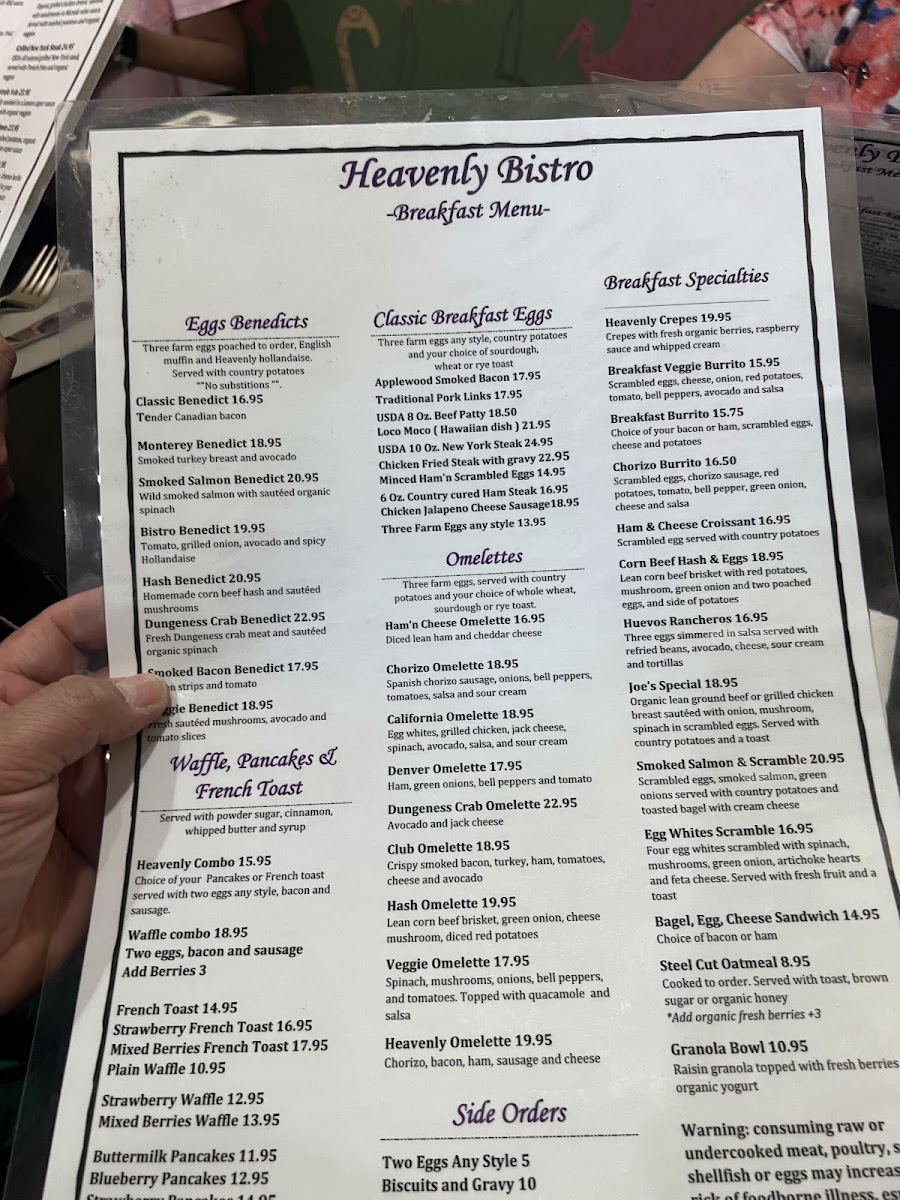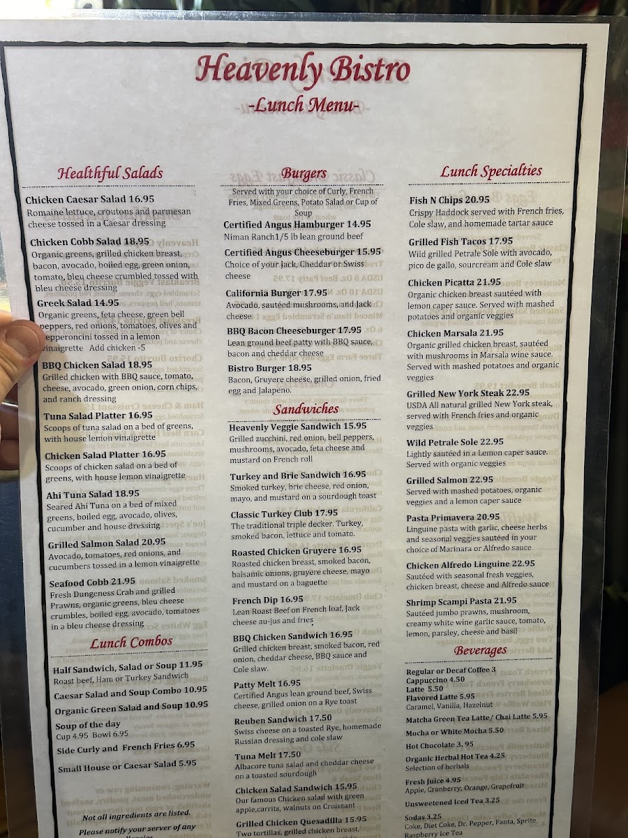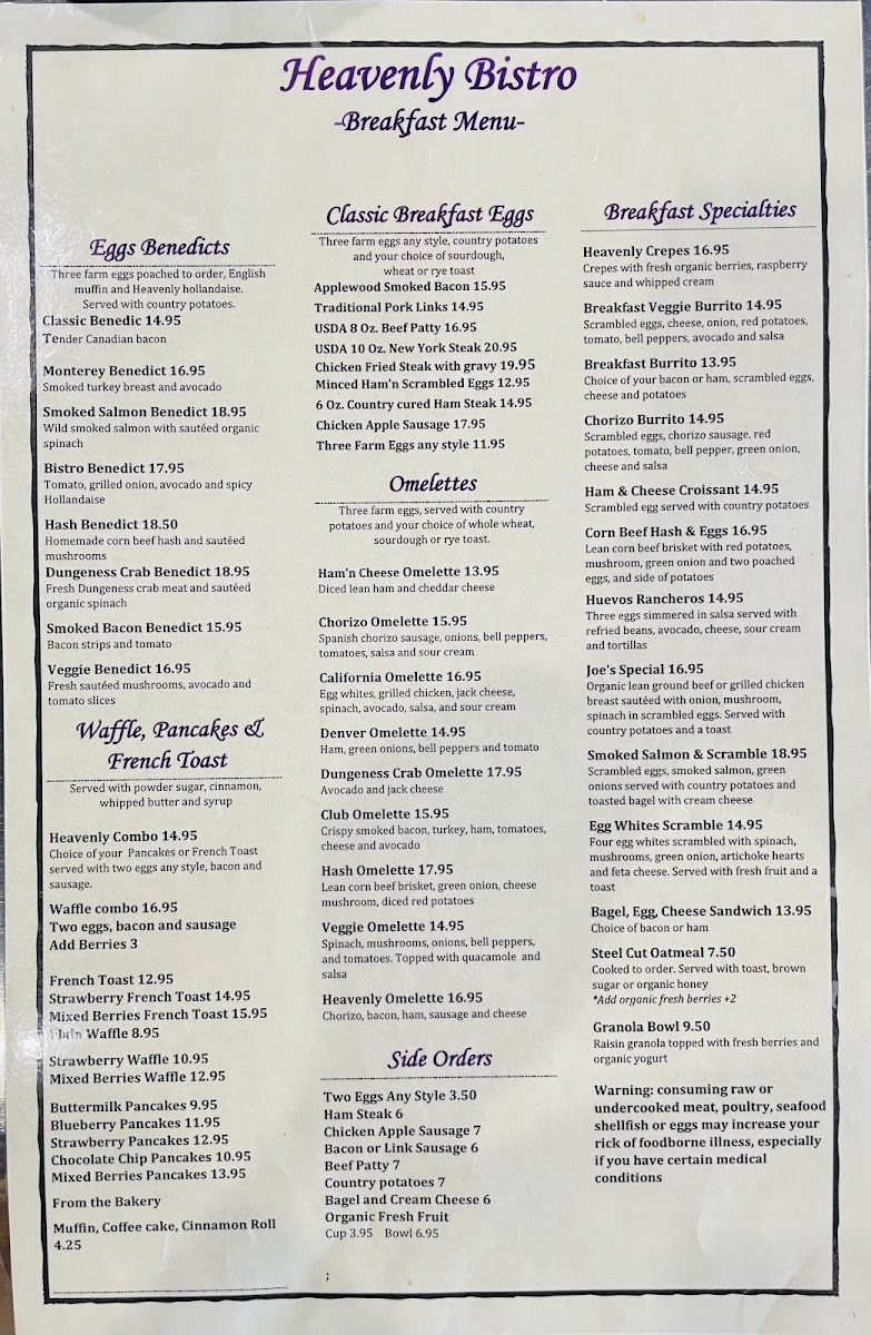 Heavenly Bistro isn’t just about breakfast; their Lunch Specialties shine just as brightly. The Fish N Chips, featuring crispy haddock paired with French fries and homemade tartar sauce, is a crowd-pleaser at $22.95, while the Grilled Fish Tacos are a fresh take on lunch, bursting with flavors of wild grilled petrale sole, avocado, and zesty pico de gallo for just $17.95. For those seeking heartier fare, the Chicken Picatta ($23.95) offers a delectable balance of organic chicken breast sautéed with lemon caper sauce served with mashed potatoes and organic veggies.